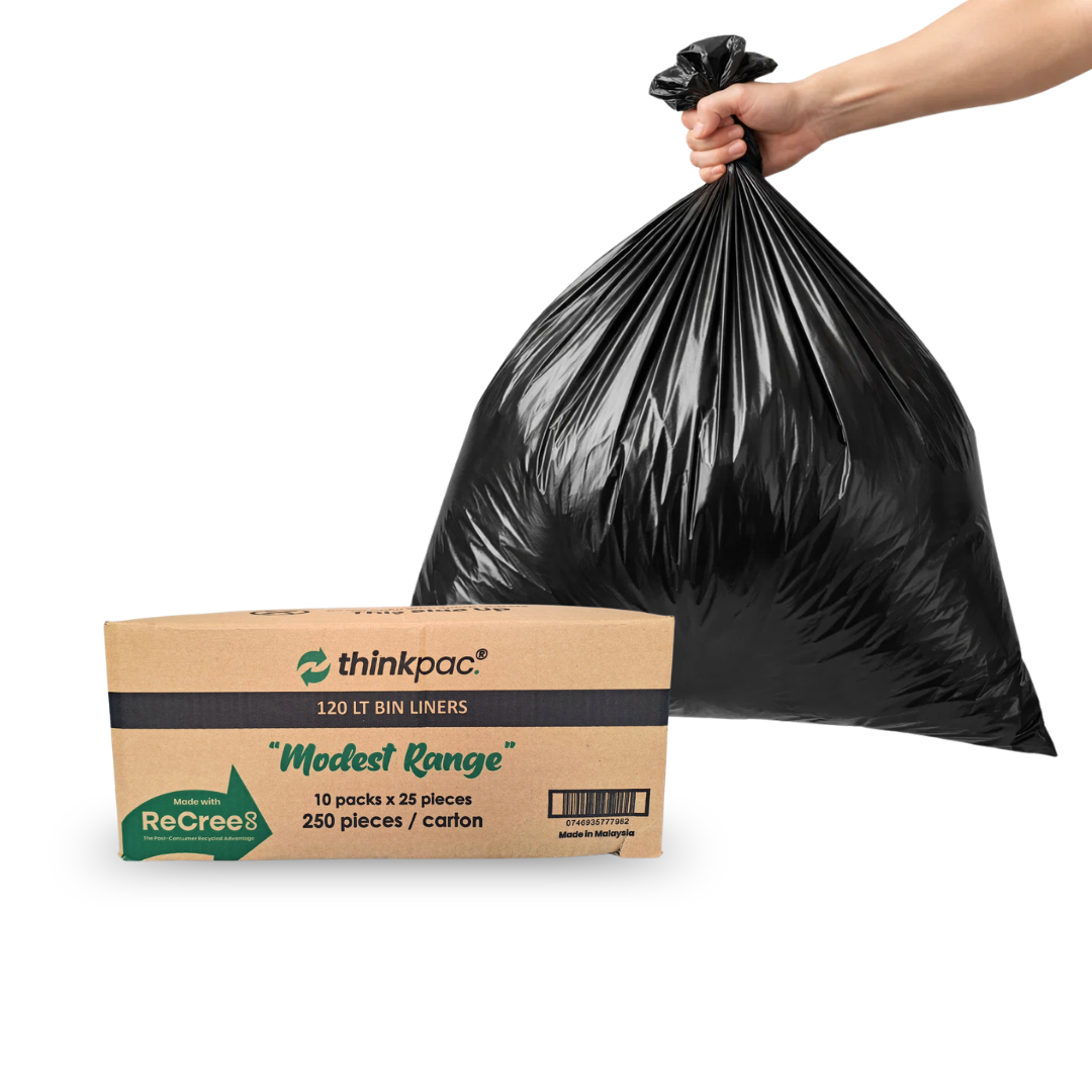 thinkpac’s range of bin liners and garbage bags is engineered for strength, consistency, and reliability in high-use environments — with selected ranges manufactured using ReCree8® post-consumer recycled (PCR) resin for organisations under increasing sustainability and compliance pressure.