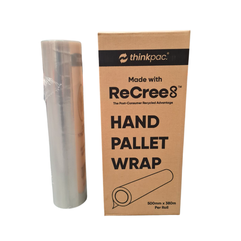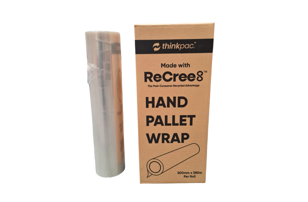 Introducing Thinkpac EcoGrip, the revolutionary hand pallet stretch film crafted from ReCree8 resin, our certified 100% post-consumer recycled resin.